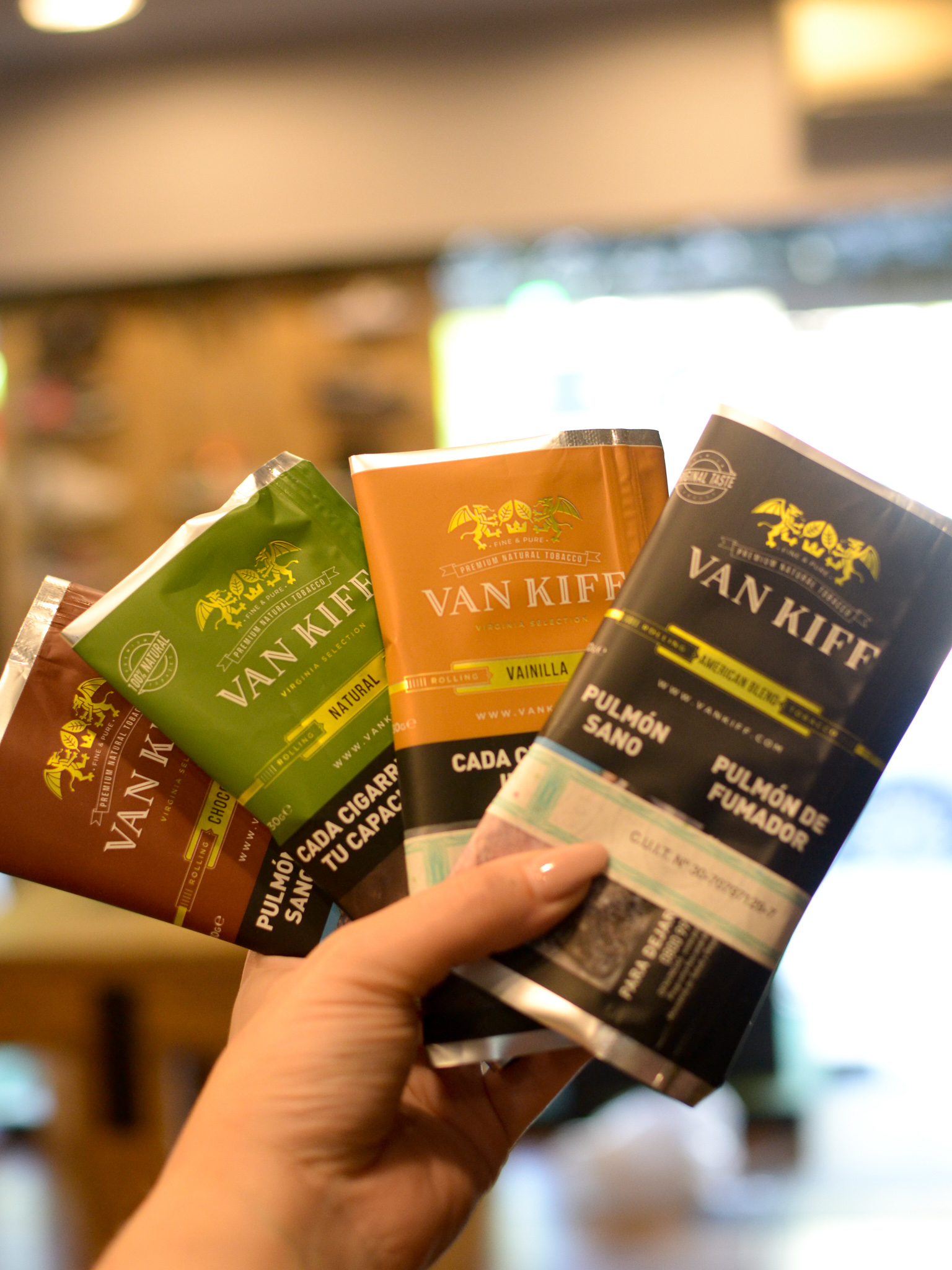 Tabaco 100% agroecológico No utiliza ningún agroquímico en su producción. Éste cuidado se traduce en un sabor suave, dulzón y persistente con las mejores notas de la naturaleza. Van Kiff Natural: Intensidad: Media Aroma: Clásico Sabor: Original, presencia en paladar Blend: Virginia Selección Estilo: Fino y Puro Van Kiff American Blend: Intensidad: Alta Aroma: Intenso Sabor: Cuerpo robusto y presente en paladar Blend: Virginia, Burley y Oriental Estilo: Fino y Puro Van Kiff Vainilla: Intensidad: Baja – Mediabaja Aroma: Suave y agradable Sabor: Dulce Blend: Virginia Selección Estilo: Dulce y Suave Van Kiff Chocolate: Intensidad: Media Aroma: Distintivo Sabor: Robusto y presente con cuerpo Blend: Virginia Selección Estilo: Fino y Puro